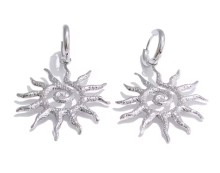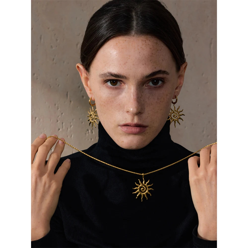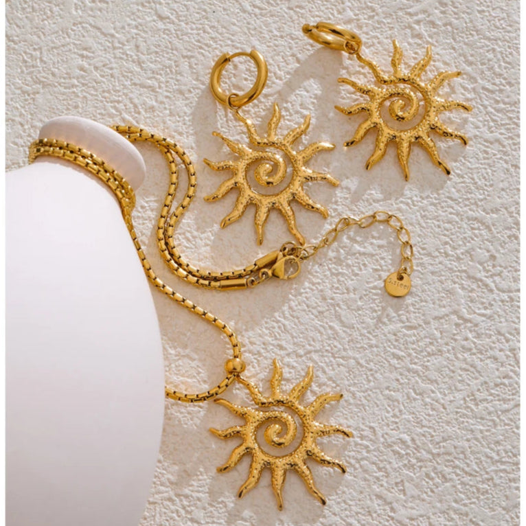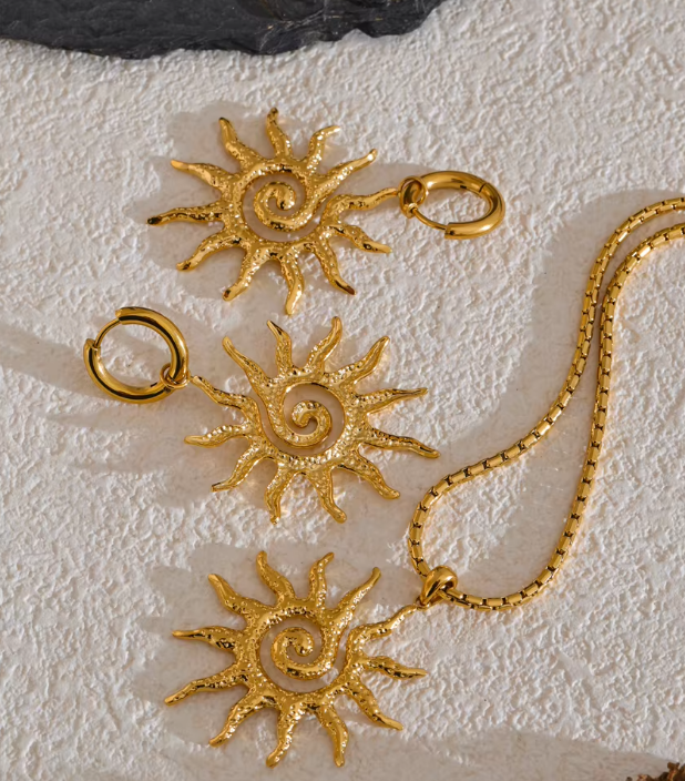 Featuring a bold sunburst design in luxe 18k Gold PVD stainless steel (or Platinum finish), this set has been spotted in trending campaigns and styled to perfection with everything from oversized tees look to beachy layers.